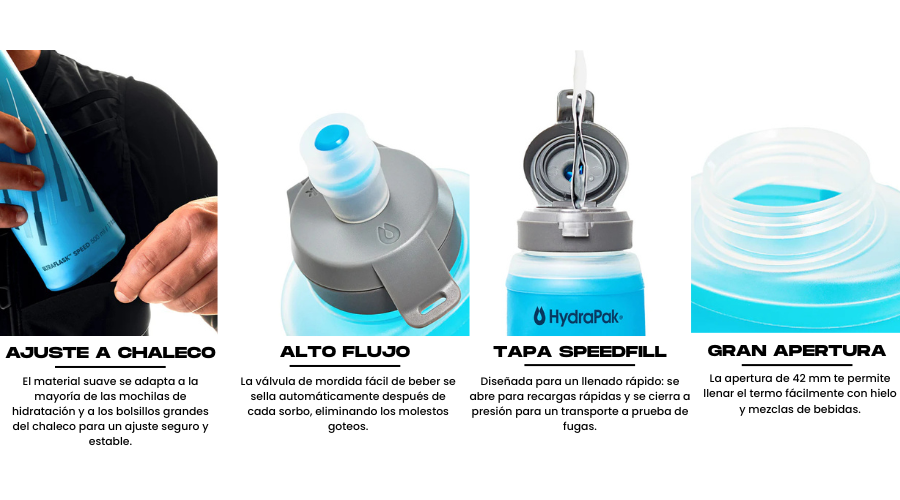 El UltraFlask™ Speed no es un bidón blando común. La clave está en su nombre: Speed. Ha sido diseñado específicamente para integrarse en los chalecos de hidratación de alto rendimiento, ofreciendo una estructura que facilita la vida del corredor cuando el cansancio aprieta y la precisión escasea.