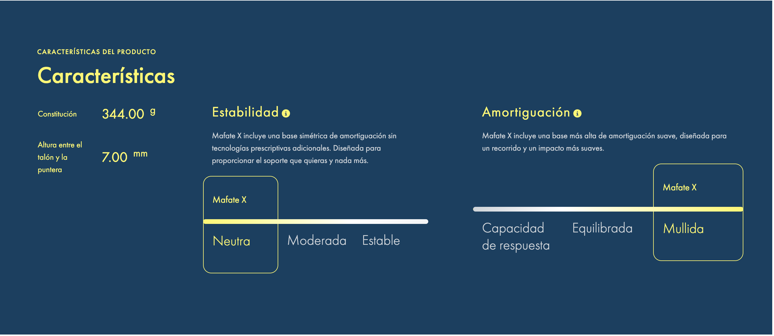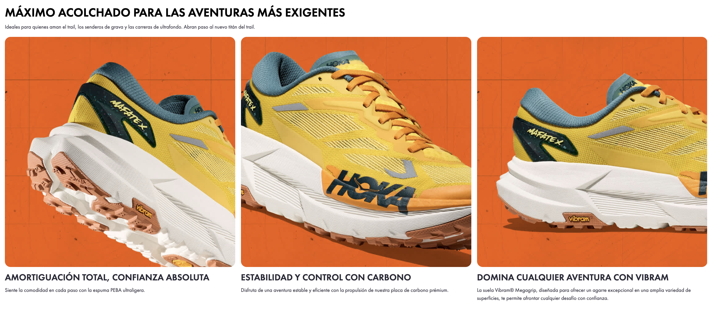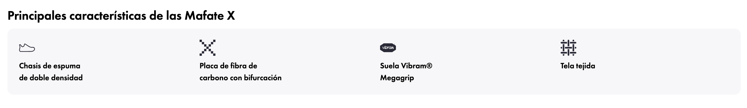 Máximo acolchado para las aventuras más exigentes. Ideales para quienes aman el trail, los senderos de grava y las carreras de ultrafondo. Abran paso al nuevo titán del trail. Las Mafate X, con un diseño para acompañarte en los mayores desafíos, ofrecen un excelente acolchado con un chasis de espuma de doble densidad, una capa superior de PEBA y mayor propulsión gracias a la placa de fibra de carbono bifurcada. Además, su empeine de tejido ultraligero facilita el drenaje, mientras que la suela Vibram® Megagrip con tacos garantiza una pisada suave en terrenos variables.